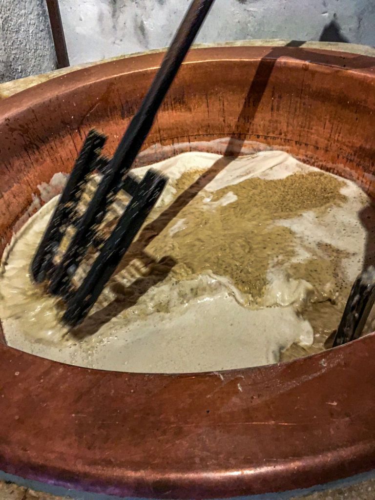 In der Brauerei angekommen steht man vor einem Kupferkessel mit ungefähr 1000 l Fassungsvermögen. Er wird durch einen, mit Holz befeuerten, Kamin beheizt. Sobald das Feuer brennt werden Wasser und Maische in den Kessel gegeben. Ab jetzt wird mit den sogenannten Harfen fleißig gerührt – die Maische darf sich nicht auf dem Boden absetzten, da sie sonst anbrennen könnte, was sich im Geschmack des Bieres Wiederspiegeln würde. Das Gemisch muss langsam auf 75°C erhitzt werden. Die ganze Zeit über muss unablässig gerührt werden. Zeitlich dauert dieser Teil etwa 1 1/2 bis 2 Stunden. Ab hier wird einem auch klar, warum die Gruppe aus 11 Mann besteht. Auf längere Zeit ist das Rühren sehr anstrengend und die Männer übernehmen den Löwenanteil! Um das ganze etwas aufzulockern, wird die Gruppe ab der Hälfte geteilt. Der eine Teil darf Frühstücken, während der andere weiter rührt. Danach wird gewechselt.