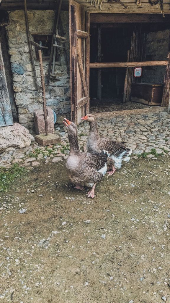 Der Weg führt zurück zum Wirtshaus „Zum Wolfen“, an dem auch das Museumsbräu angeschlossen ist, das im zweiten Teil des Beitrags eine größere Rolle spielt. Hinter der Wirtschaft gelang man zum Feld- bzw. Kinderstadel, wo diverse Spiele für Kinder aufgebaut sind. Weiter führt der Weg, wieder hinaus aus dem Kern, zur Kasalm. Von dort führt der Weg wieder zurück zum Behamhof, der als neuester Hof zum Museum gekommen ist. Alle Gebäude wurden dem Museum entweder geschenkt oder von ihm erworben – die originale Bausubstanz wurde am Ursprungsort abgebaut und hier her verlegt. Auch die Tiere des Bauernhofs dürfen im Museum nicht fehlen. Sie blenden ganz natürlich im Umkreis der genannten Höfe ein.