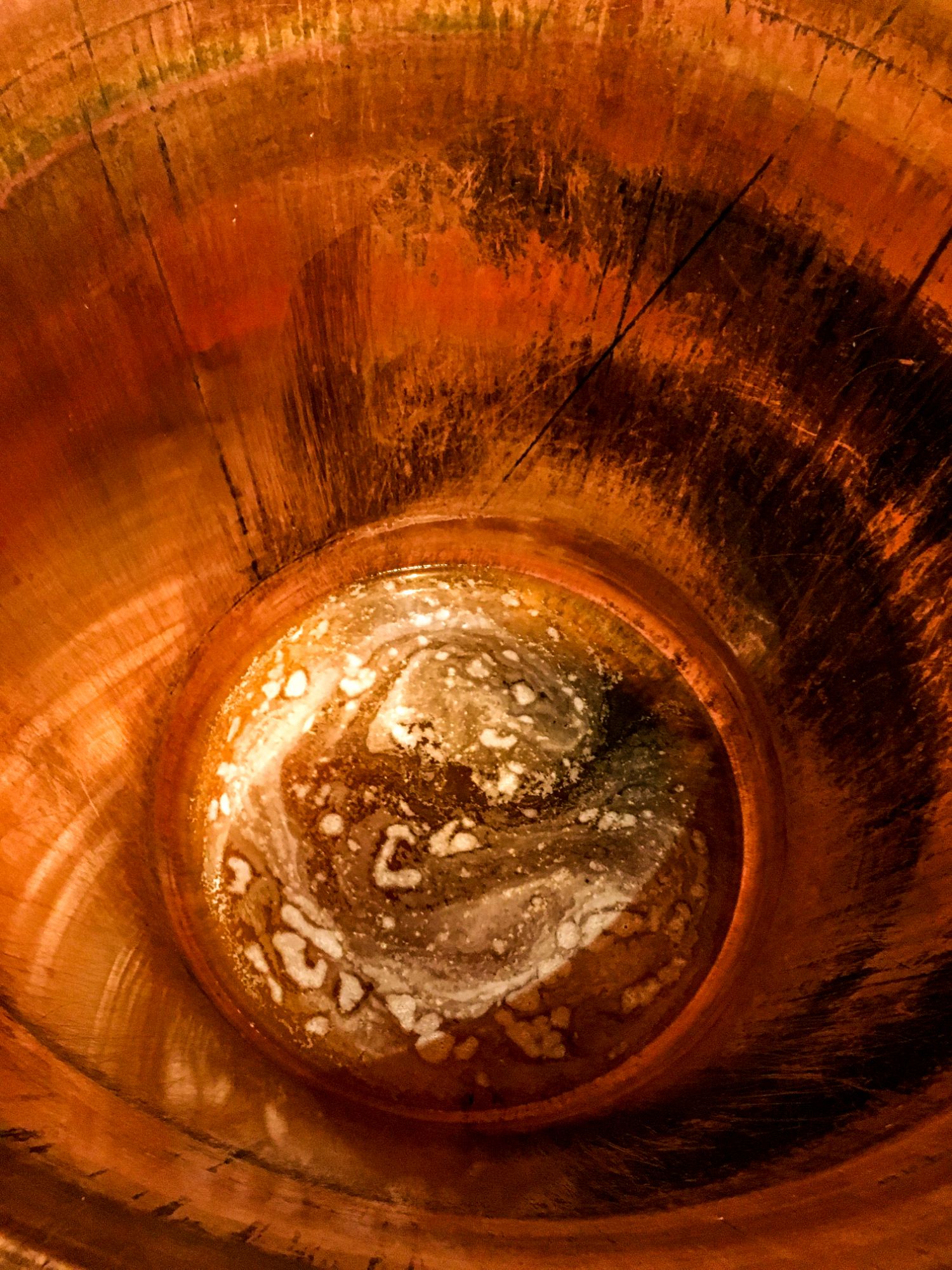 Wenn das Bier auf Temperatur gebracht wurde folgt der nächste Schritt: Es wird geläutert. Das bedeutet: Die Flüssigkeit muss aus dem Sudkessel in den Läuterbottich geschöpft werden. Im Inneren des Bottichs befindet sich ein metallenes Sieb, das das Bier vom sogenannten Trester trennt. Bis es soweit ist sind allerdings drei Aufgüsse von Nöten. Die abgeläuterte Flüssigkeit wird dann wieder zurück in den Sudkessel geschöpft.