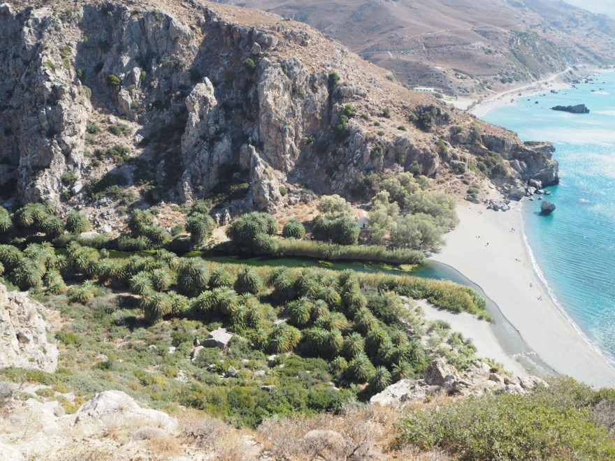 Zu eben genanntem Strand hinunter gelangt man über eine in Serpentinen geschwungene Steintreppe. Die Besonderheit: hier findet man den einzig natürlich gewachsenen Palmenhain Kretas! Morgens ist es noch sehr ruhig und idyllisch am kleinen Strand. Ab ca. 11 Uhr ändert sich dieses Bild jedoch – es werden gefühlt alle 30 Minuten Touristen aus den naheliegenden Orten per Boot an den Strand gekarrt. An sich wäre das vielleicht noch nicht so schlimm, aber bei An- und Abfahrt ertönt dreimal ein hupen, damit auch jeder mitbekommt wann das Boot an- oder ablegt….