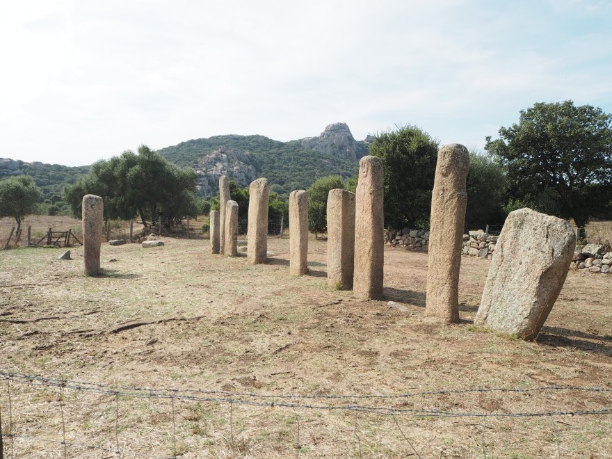 Nach einem nicht mal 10 minütigen Spaziergang durch die Ebene – hier brennt die Sonne zur Mittagszeit erbarmungslos herunter – gelangt man zum Alignement de Renaghju. Auch hierbei handelt es sich wieder um eine Steinreihe. Die einzelnen Steine sind teilweise in einem Halbkreis angeordnet. Auch hier sind sie, wie schon an der vorigen Fundstätte, nach Nord-Süd ausgerichtet. Die ersten Hinkelsteine wurden gegen 4600 v. Chr. aufgestellt. Im Schutz von Steineichen kann man sich hier in Ruhe umsehen und erkennt immer neue Anordnungen.