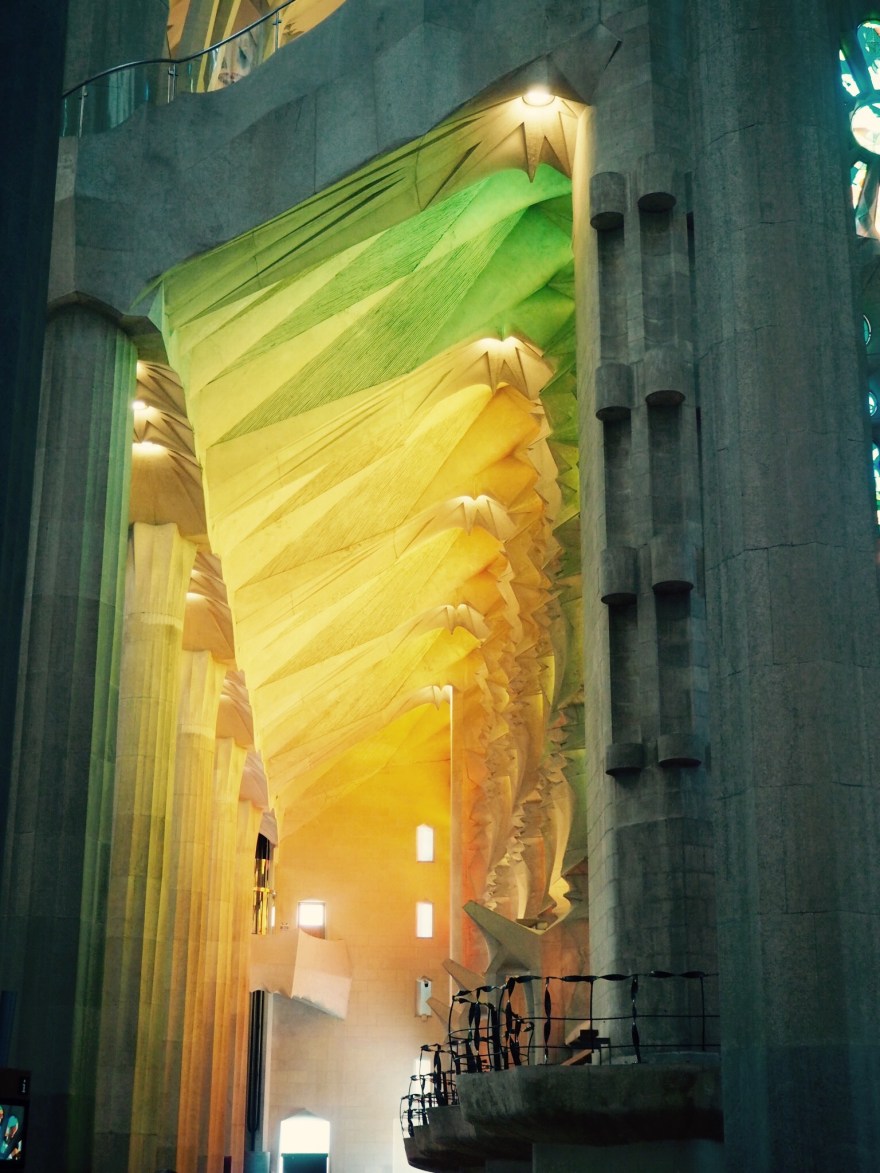 Mit der U-Bahn gelangt man am einfachsten zur Sagrada Familia, die ihre eigene, gleichnamige Station hat. Nachdem man den Marathon mit Karten kaufen, Zeitfenster abpassen und Schlange stehen hinter sich hat, darf man endlich auf den Vorplatz der – im Stil des Modernismen gestalteten – Kirche. Momentan wird gerade an den linken Türmen gearbeitet , wodurch das halbe Gebäude von einem Baugerüst verborgen ist – das Gebäude ist bis heute unvollendet. Die wahre Schönheit des Baus zeigt sich, wie ich finde, aber sowieso erst von Innen. Plötzlich steht man in einem bunten, lichtdurchfluteten Raum! Die zahlreichen Glasfenster an den Seiten tauchen alles in die Farben des Regenbogens. Wenn der Blick dann nach oben schweift bewundert man die vielen verschieden großen Kuppeln, welche das Dach bilden. Getragen werden diese durch organisch anmutende Säulen.